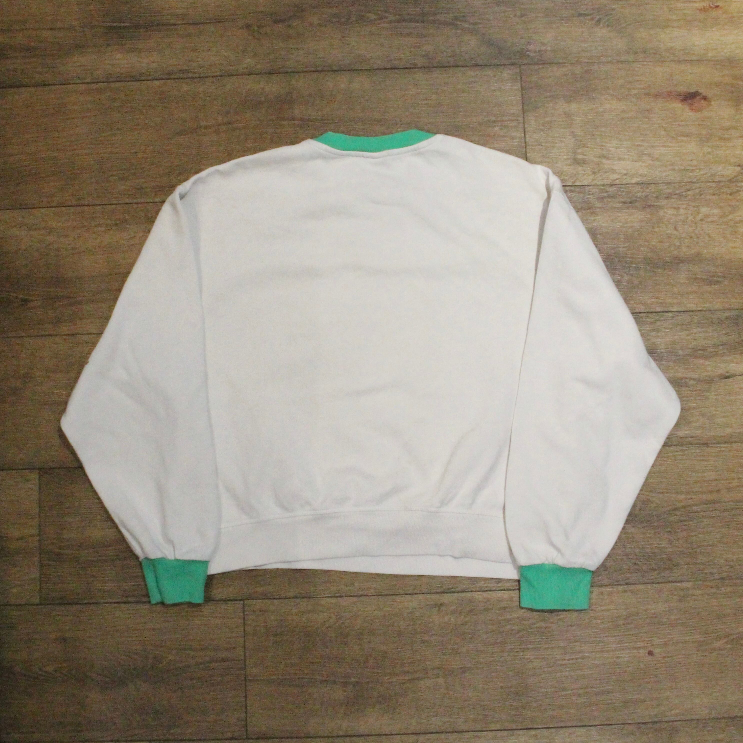 ホワイトボディにグリーンのリブとロゴが映える一着