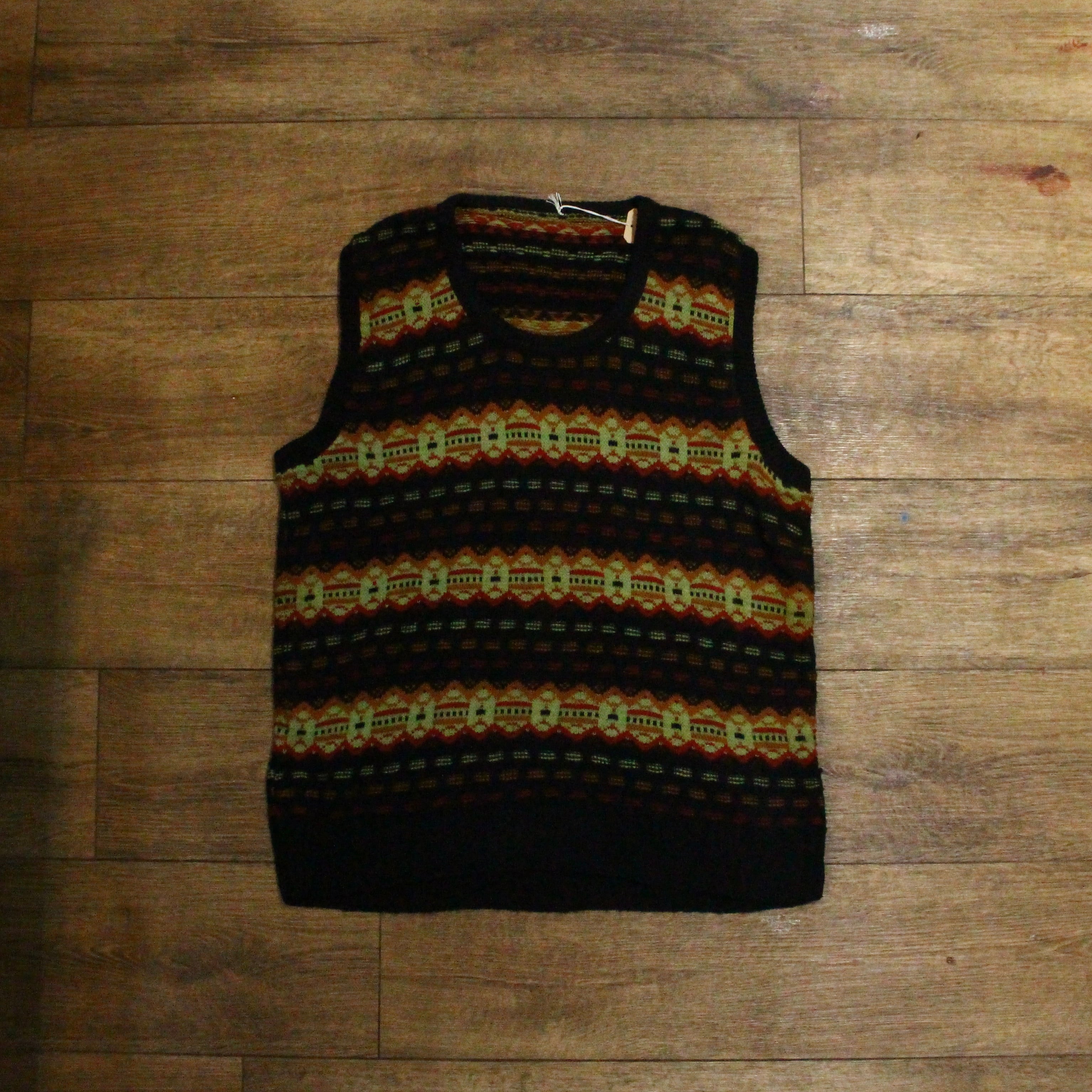重なり合うエスニック調パターンのニットベスト
