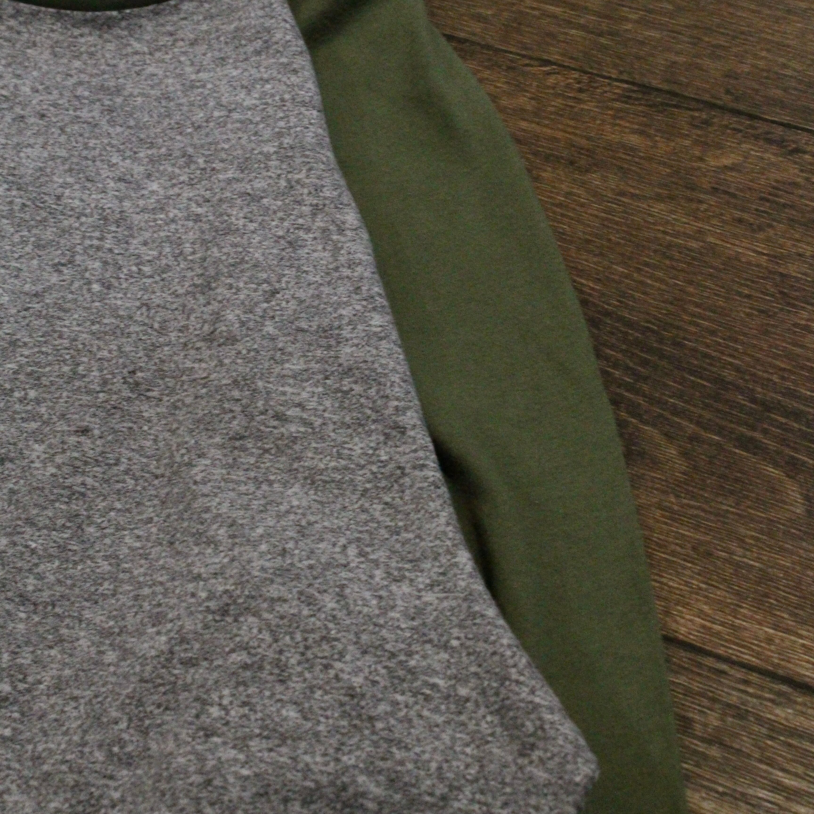 グレー×オリーブの落ち着いた配色が魅力のラグランT